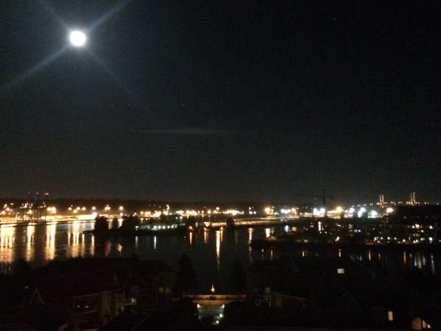 A terrible phone camera picture of a lovely view of the full moon over the Fraser River.